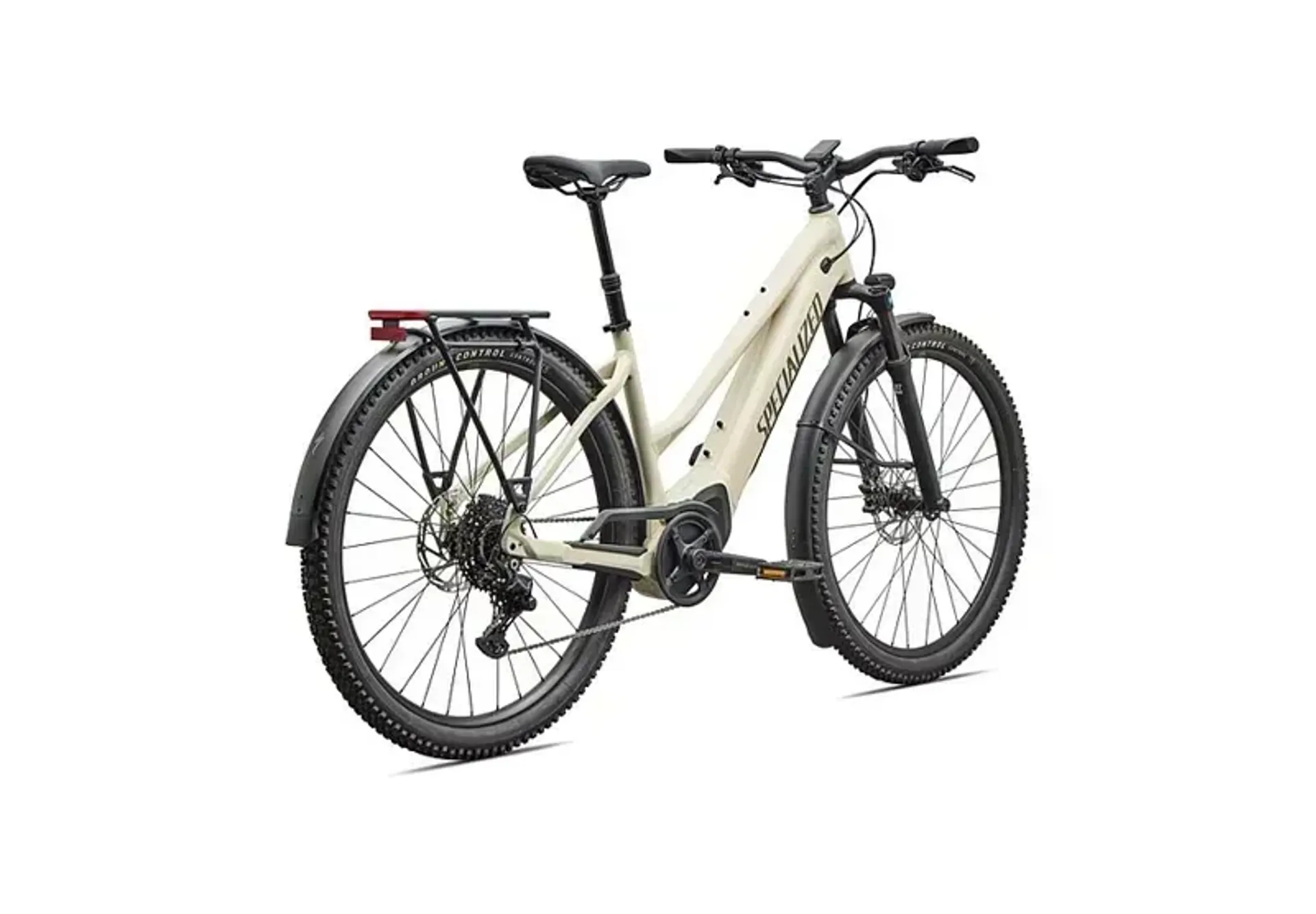 E5 Aluminum, mid-drive motor, fully integrated & lockable downtube battery, internal cable routing, wheel lock mount, and front rack compatible